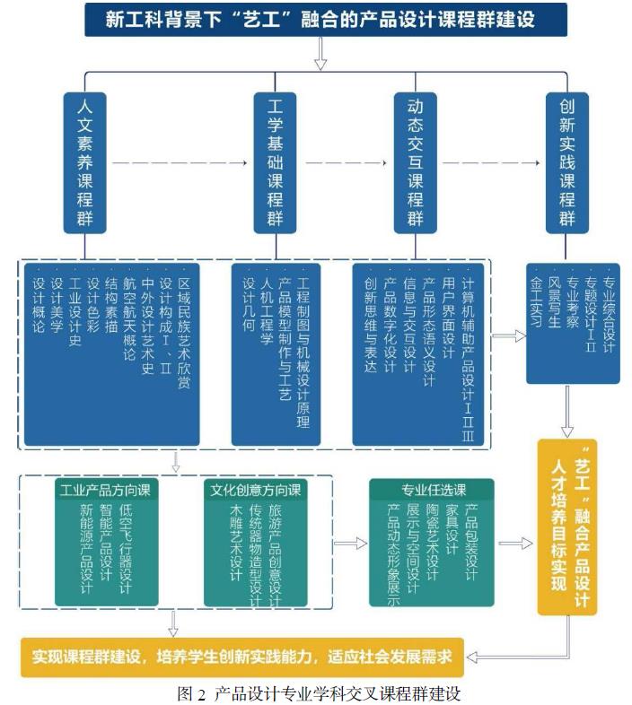 跨学科教育在新工科建设中成为解决传统教 有顽疾重要的途径和手段, “艺工”融合对于产品设计专业的发展至关重要。项目组厘清人才培养目标所需的知识结构,通过课程体系 调整来满足产品设计人才培养目标的需要,科学设置艺术与工学类课程,并按类型组织课程群。“课程群”即按课程的内容的相关性,从培养目标、开课顺序、内容衔接、实践操作、成果展示等层面,将课程组群。解决各学科专业教师互动交流问题,理顺各门课程间的逻辑关系,课程内容由割裂走向有机衔接(如图2 所示)。