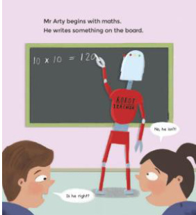 以《丽声北极星分级绘本》第三级上的故事类读物“The New Teacher”为例,该绘本介绍了一个机器人老师(Mr Arty)在学校工作的经历。教师引导学生观察绘本图片、阅读相关内容,并提问 “What does Mr Arty teach?”“Is Mr Arty right or wrong?”学生会发现,这个机器人身兼数职,既教数学,又教美术,还教地理,可是他在课上却频频出错。教师还可深入提问“Is he a good (sport) teacher?”引导学生通过理解、分析、归纳、推理等深层次学习全面概括 Mr Arty 的特征(包括优点和不足之处),推理故事走向,最终揭示故事结尾,拓展学生的逻辑思维能力。