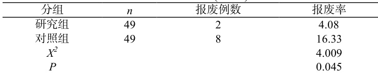 研究组报废率显著低于对照组( P<0.05 )。见表 1。