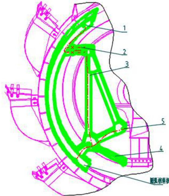 为适应无人化料场发展,圆弧档料板原有的结构越来越不适应无人化料场。由于斗轮堆取料机的斗轮机构是关键的取料机构,斗轮机构的取料通过取料斗子与圆弧档板的配合,把需要的散料转运到斗轮机构上部,再在上部卸料,由溜料板转运到皮带机上。在设计和装配时,要求取料斗子与圆弧档板一般留有 5.7mm 间隙,在圆弧档料板上与物料接触的地方,安装有耐磨衬板,耐磨衬板的厚度一般有 14-20mm ,耐磨衬板经过使用一段时间后,斗子与圆弧档板间隙会慢慢变大,最后大于 10mm 甚至大的达到 20-25mm ,当间隙大于 10mm 以后,取料时就会有物料从间隙泄漏出来,造成取料能力下降,浪费能源,同时会产生固体尘埃,对于整机的维护造成不利影响,也对环境造成一定的污染。为满足无人化料场的使用,斗轮机构增加一套全自动调节装置,通过短距离激光测距仪测量取料斗与圆弧挡料板距离,如距离变大超过允许范围,通过 PLC 控制器给动力油缸命令,以动力油缸为动力使圆弧挡料板自动绕回转铰轴做圆弧运动,动力油缸伸长,调整取料斗子与圆弧挡板距离,再通过微调油缸伸长缩短,微调取料斗与圆弧挡料板的距离,从而防止取料物料洒出,达到全自动调节取料斗与圆弧挡料板间距,从而实现斗轮机构无人化全自动取料目的(装置见图 1),辅助整机无人化取料稳定。