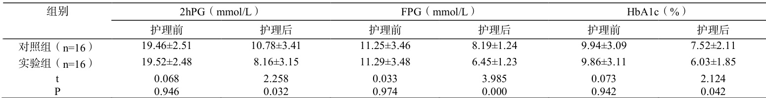 精准护理干预具有较强针对性,其根据患者个性症状、状态等实施相应护理措施,有助于促使护理措施具有较强适应性,高效促进患者病症改善[1]。在本次护理研究中,护理人员及时多方了解患者症状、状态及习惯等,进而对患者综合评估,有助于充分保障评估结果客观性,在此基础上根据评估结果对患者实施用药、饮食、生活、运动、情绪等多方面护理措施,根据患者病症及所使用药物等进行具体指导,避免其血糖水平波动幅度过大;在饮食护理过程中,护理人员根据患者血糖水平进行具体营养成分摄入量制定,根据患者具体状况进行饮食方案制定,有助于缓解患者经济压力并高效促使其血糖水平改善,精准护理价值性因此高效彰显[2-3]。
