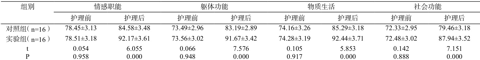 1.3.2 生活质量水平:通过情感职能、躯体功能、物质生活及社会功能体现,分数与护理质量正相关。