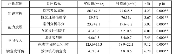 任务驱动混合教学模式在各个维度都取得了显著效果。在知识掌握方面,实验班学生的平均成绩较对照班提高了8.7 分(p<0.01),优秀率提升了23.5 个百分点。更为重要的是,实验班学生在应用性题目上的表现明显优于对照班,表明他们不仅掌握了理论知识,更具备了将知识转化为职业能力的本领。