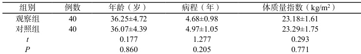 纳入 80 例患者且均确诊为盆腔炎,均于 2023 年 3 月至 2025 年 3 月被我院收治,依据治疗方案的不同将其分为 40 例对照组及与 40 例观察组,对照组的干预方案为仅采用替硝唑治疗,相较于对照组,观察组的治疗方案加用了头孢呋辛钠治疗。统计学检验结果显示,观察组和对照组的基线资料差异均未达到具有统计学意义的标准( P>0.05 ),详见表 1 。本研究不违反国家法律法规,符合医学伦理原则。