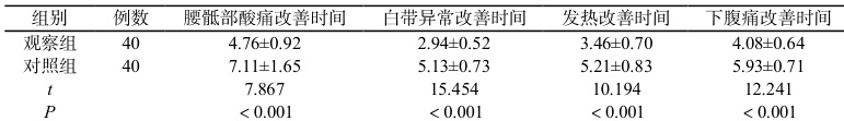 (3)临床症状改善时间:对两组患者临床症状(腰骶部酸痛、白带异常、发热、下腹痛)的改善时间进行记录并对比。