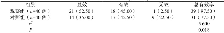 对照组与观察组相比,后者的临床疗效有效率较高( P<0.05, ),见表 2。表 2 两组临床疗效比较[n(%)]