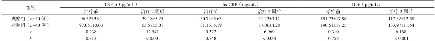 (2)炎症因子水平:选取 2 个时间节点,分别为治疗前及治疗 2 周后,采集两组患者静脉血 5ml,将血液样本作常规离心处理( r=10cm , 3500r/min ),设定时间为 10min,提取上层血液清后通过酶联免疫吸附实验法(试剂盒生产厂家为上海沪鼎生物科技有限公司)检测血清中肿瘤坏死因子(TNF-α)、白细胞介素-6(IL-6)及超敏C反应蛋白(hs-CRP)的表达水平。