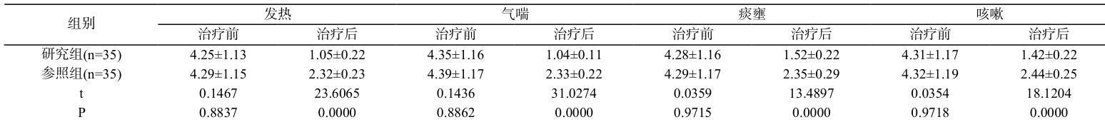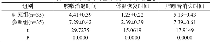 本次研究对我院 2022 年9 月 ~2024 年8 月时间范围内的 70 例小儿支气管肺炎风热闭肺证患者开展临床治疗工作;本次治疗干预小组划分依据为投掷硬币法;参照组(35 例):年龄的分布范围为 2~11 岁,计算为( 4.52±0.23 )岁平均值;病程的分布范围为 1~5d,计算为( 2.58±0.13 )d平均值;研究组(35 例):年龄的分布范围为 2~12 岁,计算为( 4.53±0.25 )岁平均值;病程的分布范围为 1~6d,计算为( 2.59±0.15 )d平均值;两组的一般资料具有均衡性( P>0.05 )。