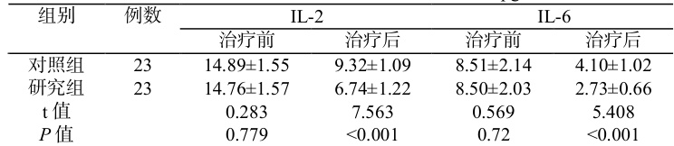 治疗后,研究组的IL-2、IL-6 水平较对照组低( P<0.05 ),见表 2