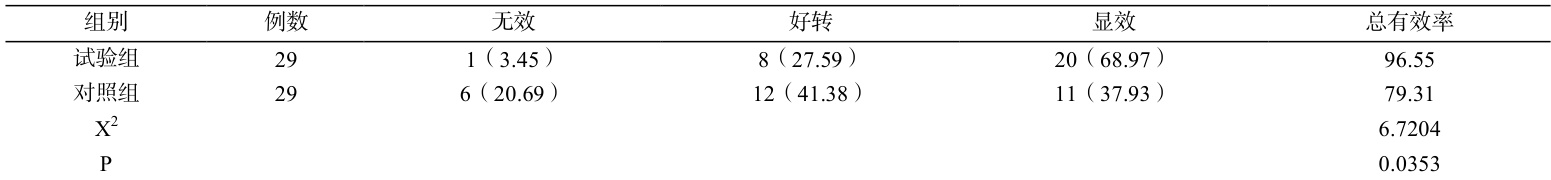 表 1 内的总有效率:试验组 96.55% ,对照组 79.31% ,