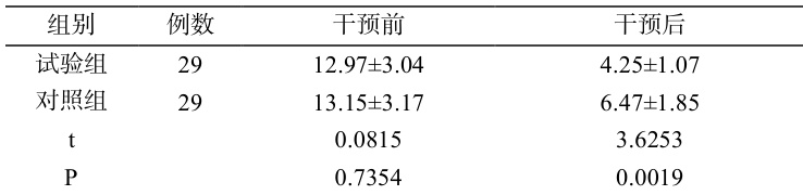 表 2 内的中医证候积分:未干预,差异不显著( P>0.05 );干预后:试验组数据更低( P<0.05 )。