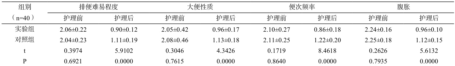 对比两组患者便秘症状评分实验组优于对照组, P<0.05 。