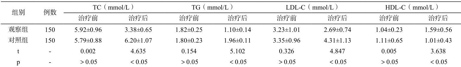 选择我院 2022 年 1 月~2024 年 12 月收治的 300 例高血脂患者为研究对象,对照组 150 例(男 78 女 72),年龄 47~79(58.74±6.21 )岁;观察组 150例(男 83 女 67),年龄 45~76(59.69±5.92) 岁。两组一般资料无明显差异(P>0.05) 。