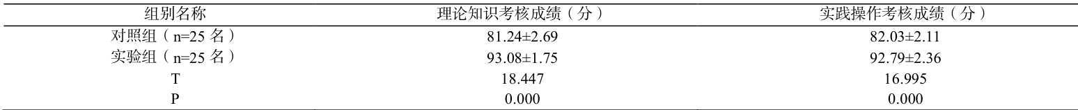和对照组相比,实验组关于理论知识考核成绩、实践操作考核成绩更高, P<0.05 。详见表 1.