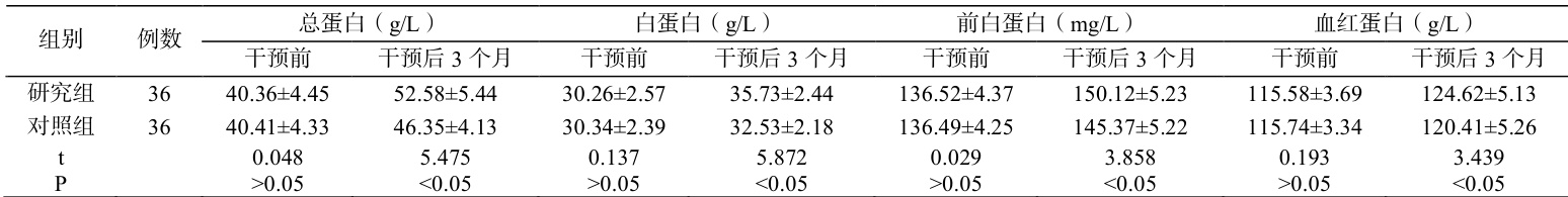 干预前,两组各营养指标数值均无明显差异( P>0.05 );干预后 3 个月,研究组均优于对照组( P<0.05 )。见表 1。