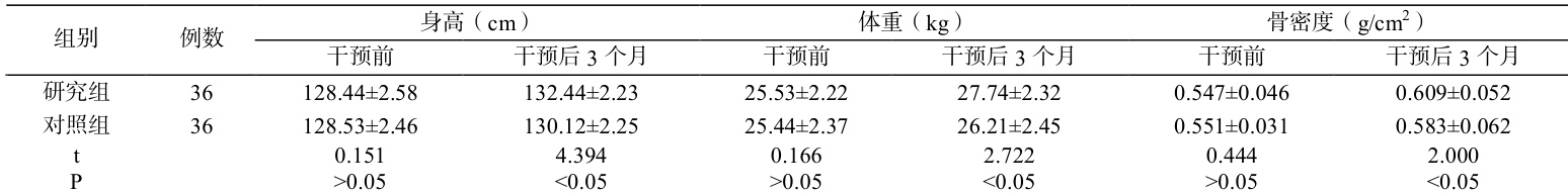 干预前,两组各生长发育指标数值均无明显差异( P>0.05 );干预后 3