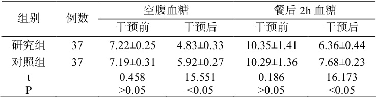 表 1 两组干预前后的血糖水平比较(