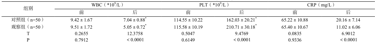 观察组治疗后 WBC、CRP 水平低于对照组,PLT 水平高于对照组