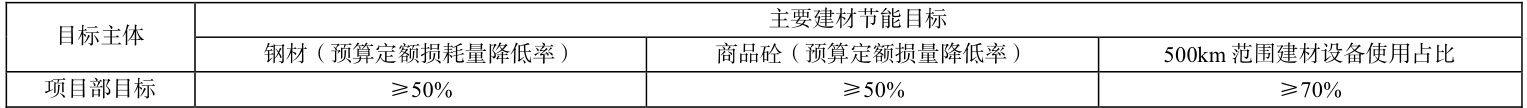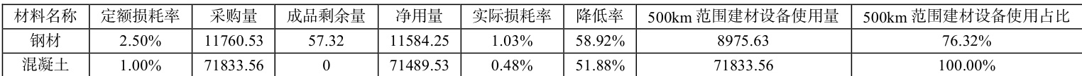本工程开工至 2024 年 12 月,钢材定额损耗量降低率 58.92%>50% ,混凝土定额损耗量降低率 51.88%>50% , 500km 范围内主要建材设备使用占比均大于 70% ,项目部建材节约目标已完成。