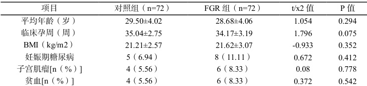 对照组孕妇年龄:18-40 岁,平均( 29.50±4.02 )岁,平均孕周( 35.04±2.75 周),平均体质指数(Body Mass Index,BMI)( 21.21±2.57kg/m2 );FGR 组孕妇年龄:18-40 岁,平均 28.68±4.06 )岁,平均孕周( 34.17±3.19 )周,平均 BMI( 21.62±3.07kg/m2 )。两组孕妇的一般资料比较差异无统计学意义(P>0.05),具有可比性。