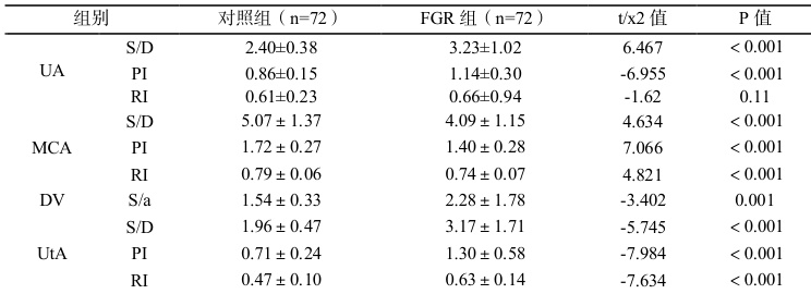 与对照组相比,FGR 组的 UA-S/D、UA-PI、和 UtA-S/D、UtA-PI 及 UtA-RI 参数均明显升高,而MCA-S/D、MCA-PI 及 MCA-RI 值则明显降低,两组之间有统计学差异( P<0.05 ),见表 2。表 2