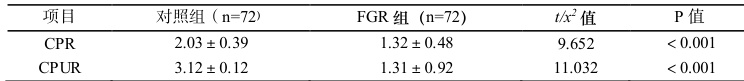 表 3 两组胎儿 CPR、CPUR 参数比较( x s )