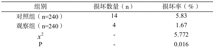 2.1 精密器械过程损坏率对比观察组低于对照组, P<0.05 ,见表 1。