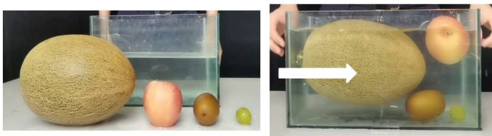 设计意图:在学生的认知中,认为大的物体,重的物体放入水中都是会下沉的,小的物体,轻的物体肯定是会上浮的。通过这些实物的创设的情景,使学生清楚的认识到物体的沉浮与物体本身大小,自身的重力其实没有任何关系,而是物体受到的重力与浮力之间的大小关系,若是实心物体,则与物体密度和液体密度大小有关。这种情境设置不仅能够建立学生的生活经验与课本知识之间的联系,还能使教学内容变得更加具体、生动、形象和富有思维性,从而有效打通学生在思维过程中的阻碍。激发学生的学习兴趣和好奇心,促进学生的主动学习,深化对知识的理解,培养学生的高阶思维和解决问题的能力。