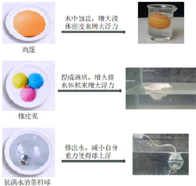 环节④改沉浮:将橡皮泥,鸡蛋和塑料球分别放入水中,请改变他们的浮沉状态。