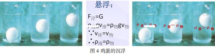 环节③研沉浮:以“鸡蛋在清水中下沉而在浓盐水中上浮”这一事实为基础,将鸡蛋悬浮时的情况进行分析: