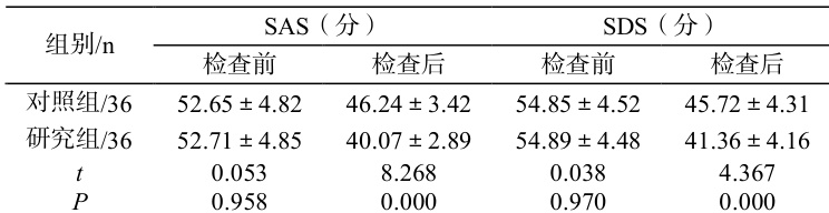 患者纤支镜检查前负面情绪评分组间对比无统计学差异( P>0.05 );研究组检查后 SAS、SDS 评分均低于对照组,差异有统计学意义( P<0.05) 见表 1。