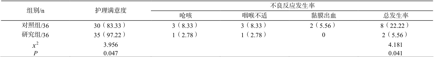 表 2 护理满意度、检查不良反应发生率对比(n, % )
