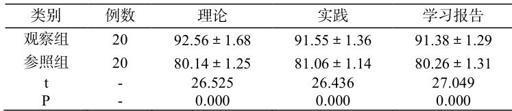 观察组的理论、 实践及学习报告考核成绩均高于参照组( P<0.05 ),见表 1: