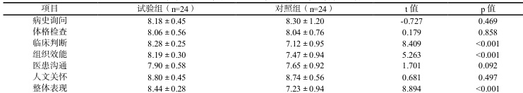 表3 试验组与对照组Mini-CEX 评分比较(分,x±s)