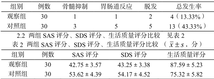 对比两组化疗并发症发生率、焦虑自评量表(SAS)评分、抑郁自评量表(SDS)评分、生活质量评分。