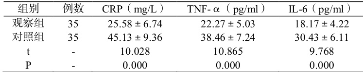 与对照组相比,观察组治疗后的的 CRP、TNF- ∝ 以及 IL-6 炎症指标更低(P〈0.05),如表 1。