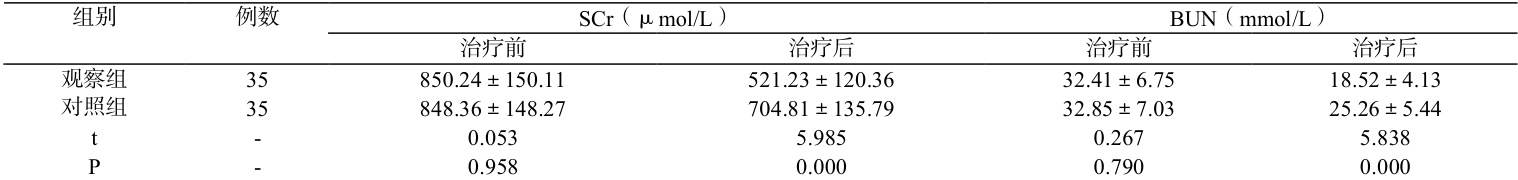 治疗前后抽取患者空腹静脉血,对其进行肾功能指标测定,使用苦味酸法测定患者的 SCr 水平,使用脲酶-波氏比色法测定患者的 BUN 水平,对比两组间差异[3]。