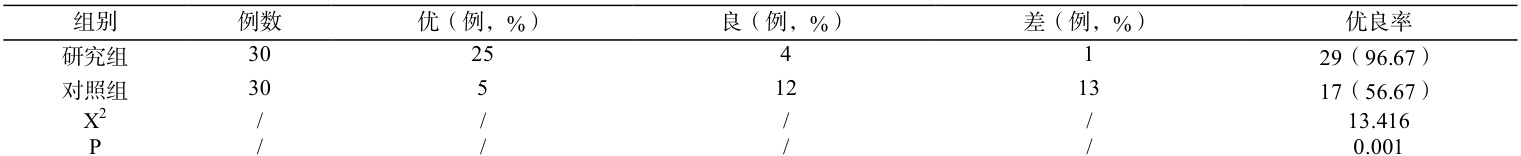 研究组不良反应发生率为 6.67%( (出现呼吸抑制 1 例、恶心呕吐 1 例);对照组不良反应发生率为 43.33% (恶心呕吐 5 例、腹痛 3 例、头晕 5 例)。研究组不良反应发生率显著低于对照组( X2=10.756,P=0.003 )。
