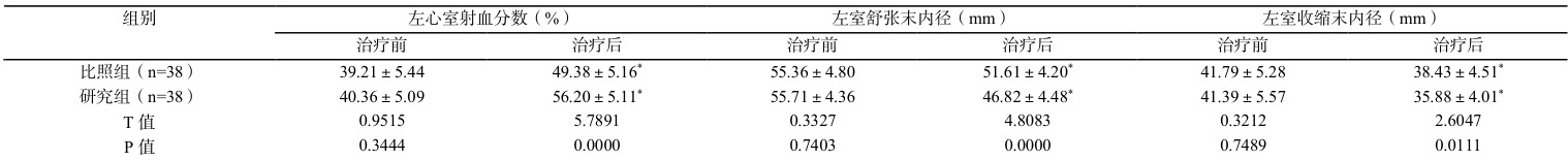 治疗前,指标水平在两组无突出差异, ΔP>0.05 。经治疗后,相比比照组,研究组左心室射血分数更高,左室舒张末内径、左室收缩末内径更小, P<0.05 见表 3