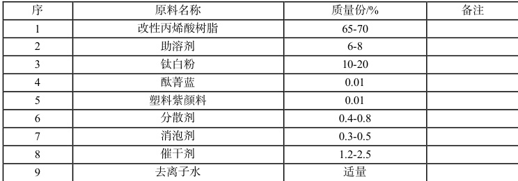 水性丙烯酸树脂,工业级,山东卡孚乐高分子材料有限公司;钛白粉(R-2196),工业级,安徽安纳达钛业股份有限公司;酞菁蓝,工业级,扬州雨虹化工有限公司;塑料紫颜料,工业级,苏州精颜新材料有限公司;分散剂、消泡剂,德国毕克化学有限公司;催干剂,工业级,南通昌辰化工有限公司;去离子水,自制。