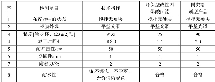 试验中通过合成改性水性丙烯酸树脂,制备的具有优异性能的丙烯酸树脂为成膜物,通过大量试验数据考察,采用 0.3%-0.8% 聚合型分散剂、聚醚嵌段型消泡剂、复合型水性催干剂等,以此为配方制备的改性丙烯酸面漆,不仅具有优异的固化性能、漆膜附着力好,而且漆膜丰满度高、柔韧性好,其各项性能能达到或超越同类溶剂型产品,具有有很好的市场推广价值。