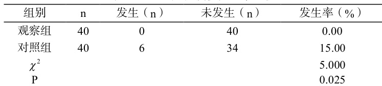 对照组中的 40 例患者给予常规的护理方法:向患者介绍病情及具体的手术方案,同时进行相应的心理疏导,缓解患者对手术产生的紧张心理。在手术中借助于海绵垫来保护受压的皮肤,监测术中体温并配合完成手术。术后对受压部位进行按摩与热敷,以确保血液循环状态良好。
