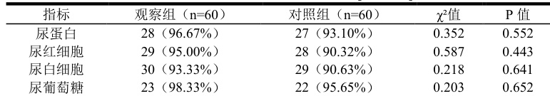 两组在尿蛋白、尿红细胞、尿白细胞及尿葡萄糖指标的阳性符合率方面进行对比,结果显示组间差异无统计学意义( P>0.05 ),具体数据见表 1。