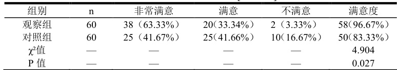 观察组检验满意度达 96.67% ,较对照组的 83.33% 更高,经统计学分析,两组间该指标差异具有统计学意义( P<0.05 ),具体数据见表 2。