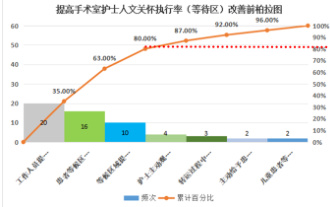 手术室护士人文关怀执行率低的主要阶段是为:等候手术期间和手术中。汇总数据分别绘制等候手术期间柏拉图,见图1 和手术中柏拉图,见图2。根据80/20 原则确定等候手术期间的改善重点是工作人员提前进行温湿度调整,患者等候区域提供保暖用品,等候区域提供便民措施。