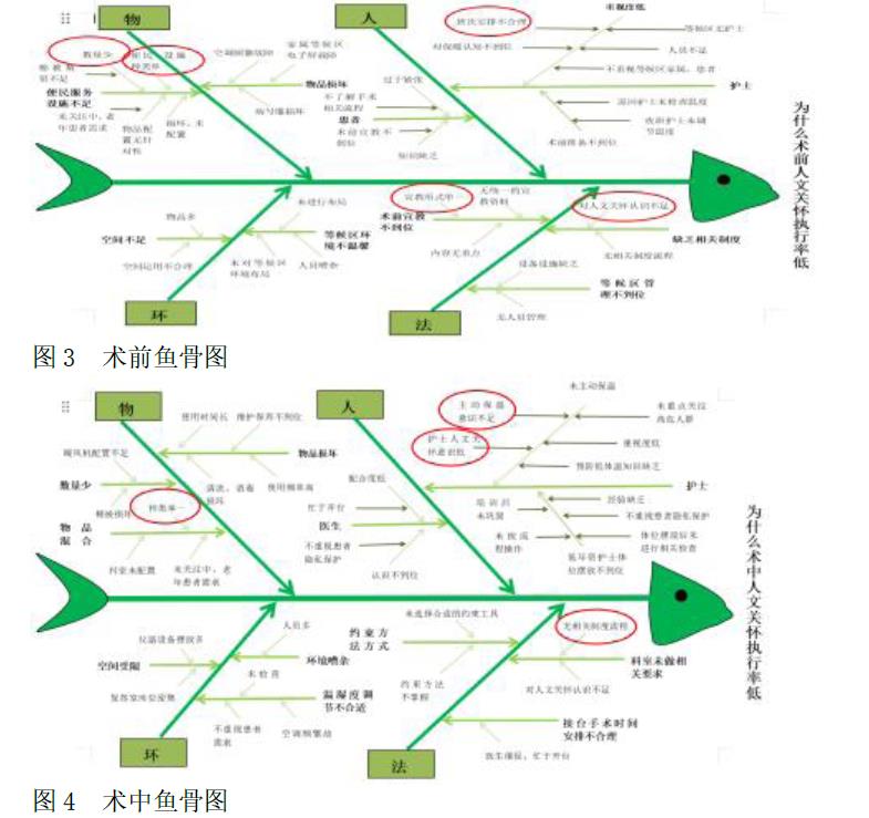 全体圈员进行头脑风暴,绘制鱼骨图(等候区)(见图3),从人,物,环,法四个方面进行分析,找出要因并进行分析 以重要的5 分,一般的3 分,不重要的1 分,根据80/20 原则,选定32 分及以上为要因 。对找出的要因进行真因验证。2024 年 7 月 21 日—27 日调查 142 次等候区护士人文关怀情况,其中对人文关怀认识不到位 30 次 ;宣教形式单一2 6 次 ;便民设施种类单一2 4 次 ;无相关制度流程20 次;班次安排不合理16 次,前 5 项原因共为 116 次(82%)。 根据 80/20 法则,圈组将对人文关怀认识不到位 ;宣教形式单一;便民设施种类单一 ;无相关制度流程;班次安排不合理5 项原因列为真因。对“为什么术中人文关怀执行率低”也进行了相应的鱼骨图分析(见图4),2024 年7 月 21 日—27 日调查 92 次术中护士人文关怀情况, 其中主动保温意识不足为 23 次 ;便民设施种类单一为 20 次;护士人文关怀意识低为 18 次;无相关制度流程为 15次。前 24 项原 因共 76 次(83%)。根据 80/20 法则,圈组将主动保温意识不足 ;便民设施种类单一;护士人文关怀意识低;无相关制度流程4 项原因列为真因。