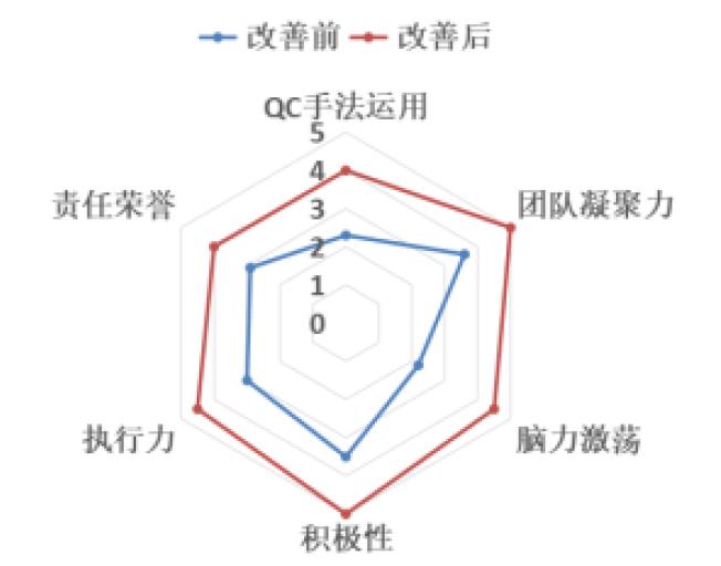 品管圈活动后,圈员在责任荣誉、执行力、积极性、脑力激荡、团队凝聚力、 QC 手法运用6 个方面均有提高。见图5。