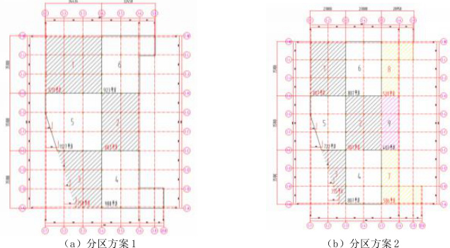 (1)楼层施工顺序及分区优化:考虑雨季影响,计划选择晴天时,先施工5 层地坪,以对2-4 层形成保护,便于施工,竖向浇筑顺序: 5432 层。根据楼板浇筑平面面积,采用跳仓法浇筑,以保证地坪不开裂。为保证施工进度,并考虑现场实际情况,设计两种大小分区,施工时根据实际需要确定。