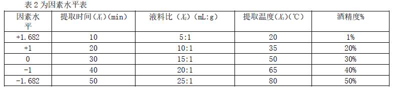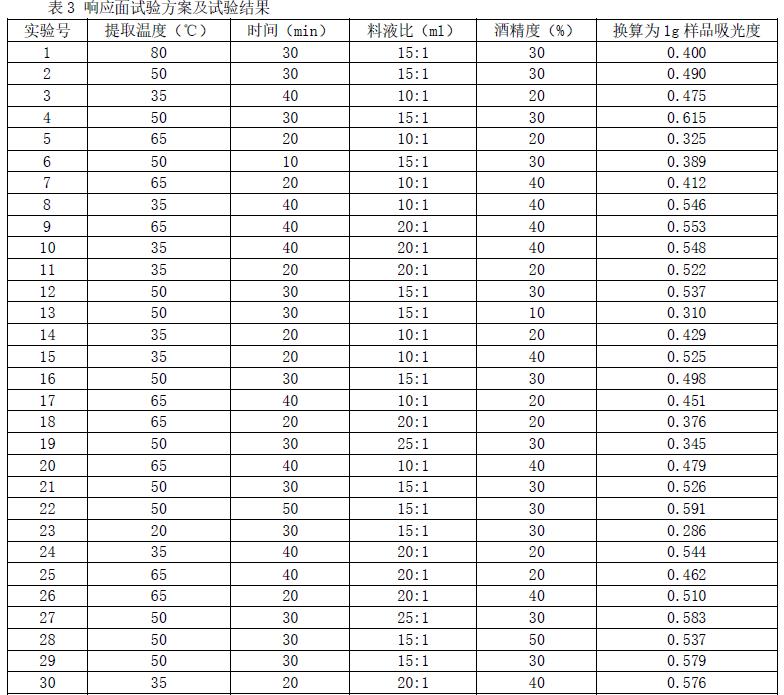根据已建立的数学模型, 在-1.682≤Xi≤1.682( j=1 ,2,3)范围内,每个因素取 5 个水平(±1.682,±1 ,0),对 5s=125 个方案进行统计寻优, 在试验范围内可得吸光度的最高值为 0.615, 此时各因素取值为:X1=-1 , Xz=-1 .682, X3=1 .682,X4=1 对应着提取温度为 51.14℃,液料比为 19.99:1,提取时间为 39.9min,酒精度 37.47%。