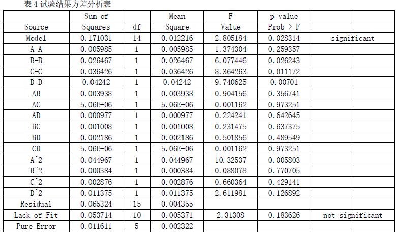 Y=0.540833-0.01579X1+0.033208X2+0.038358X3+0. 042042Xi+0. .015688X1X2+0.000563X1X3+0.007813X1X4-0.00794X2X3-0.01169X2X4-0.00056X3X4-0.04049X1 -0.00374X2 -0.01024X3 -0.02036X4
